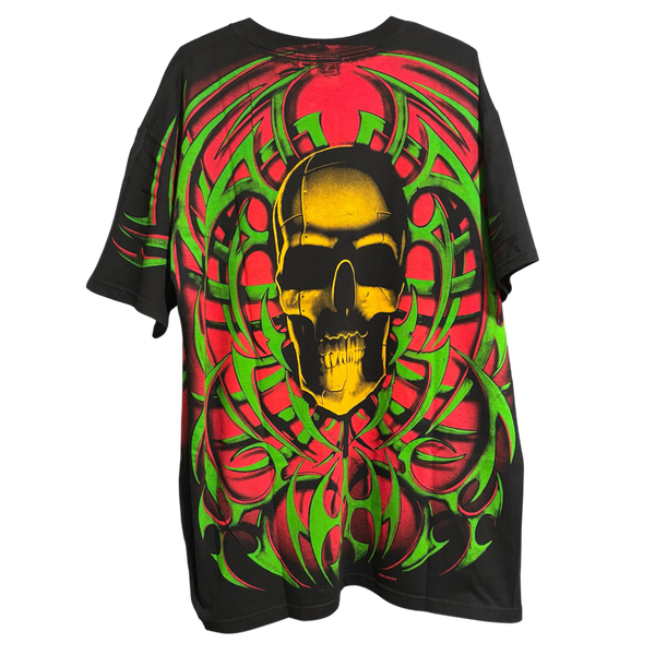 - Double-sided All Over Print / 1998 Liquid Blue / Yellow skull graphic with tribal elements /