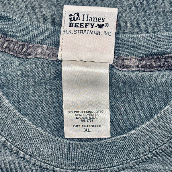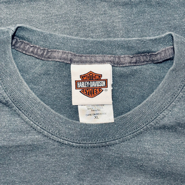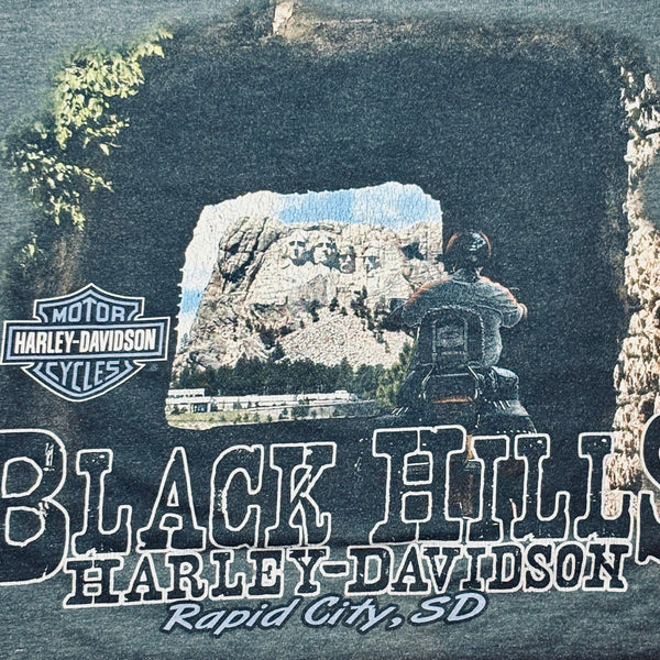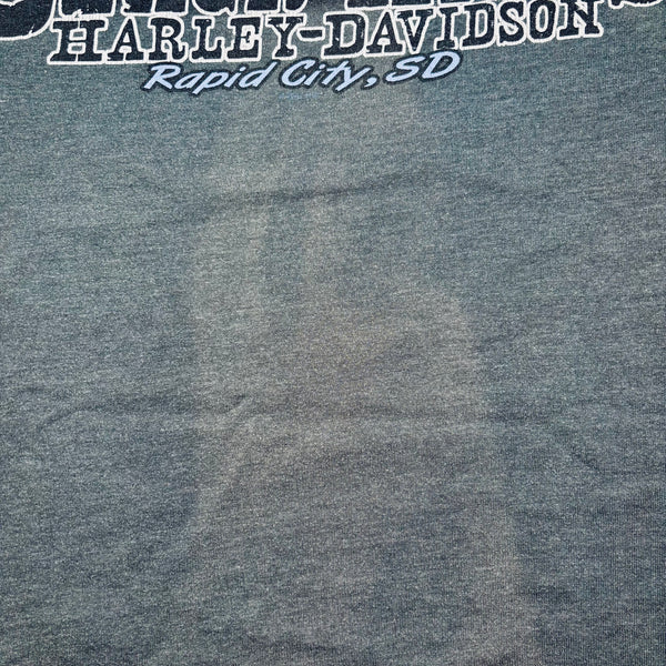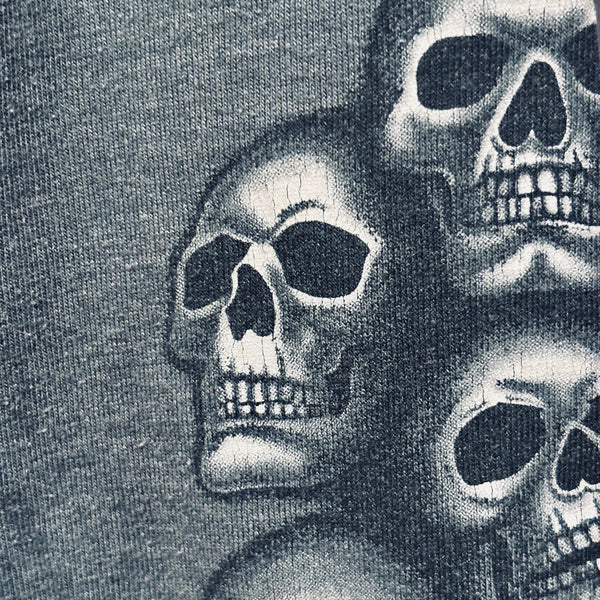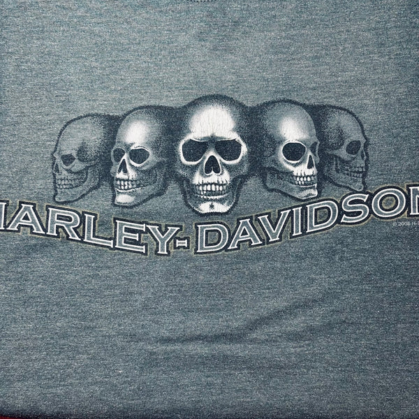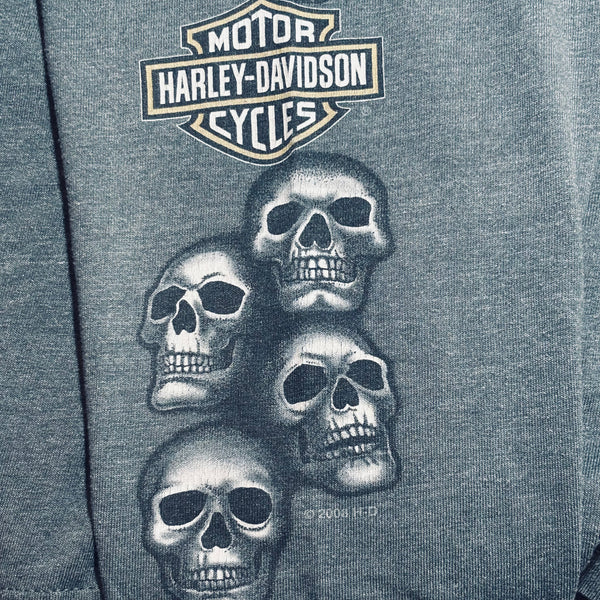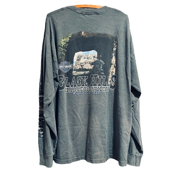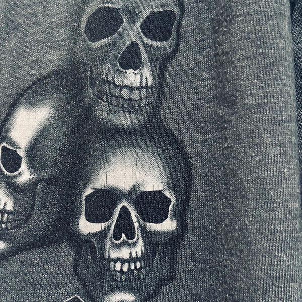 Harley-Davidson multi skull long sleeve tee with skulls on sleeves and center front / Black Hills Harley-Davidson Rapid City SD back hit / R.K. Stratman, Inc. Hanes Beefy T tag / Made in USA / 60% cotton 40% polyester