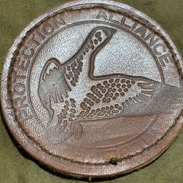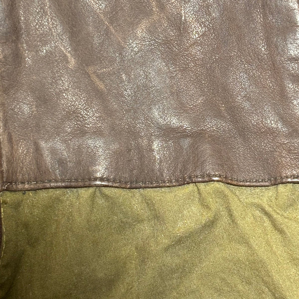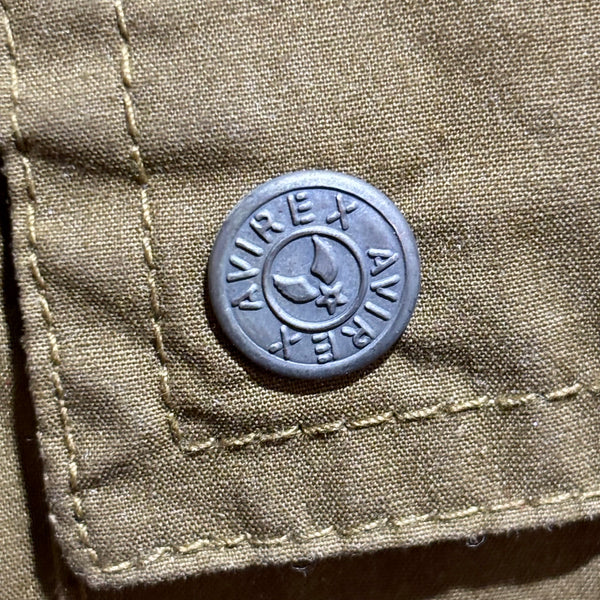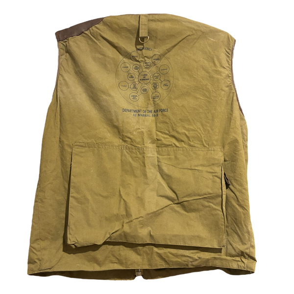 Avirex Country utility flight vest with leather shoulder and trim / Department of the Air Force AF Manual 64-3 back graphic / 8 front utility pockets with button, zipper, and Velcro closures. Two inside zipped chest pockets. One large zipped back pocket / Wildlife Protection Alliance leather patch left chest / Made in Taiwan / 100% cotton shell & lining