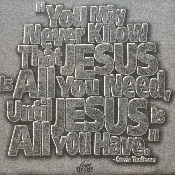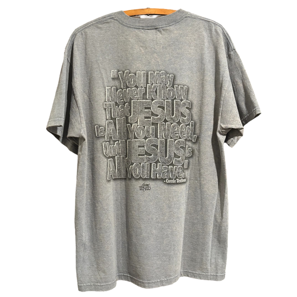 Y2k era Jesus tee / “ You may never know that Jesus is all you need until Jesus is all you have” quote by Corrie TenBoom back hit / Delta Pro Weight tag / 90% cotton 10% polyester